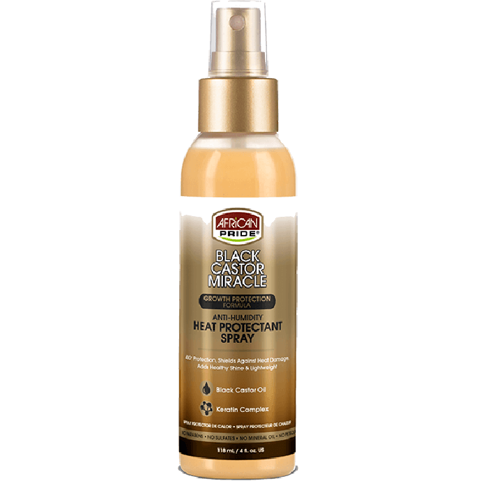 De Anti-Humidity Heat Protectant Spray uit de Black Castor Miracle-lijn van African Pride is een lichtgewicht, verzorgende spray die het haar beschermt tegen schade door hitte van stylingtools tot wel 200°C (400°F). Deze formule is verrijkt met zwart castorolie, kokosolie en een keratinecomplex, en helpt het haar glad te houden tot wel twee weken, zelfs bij hoge luchtvochtigheid.