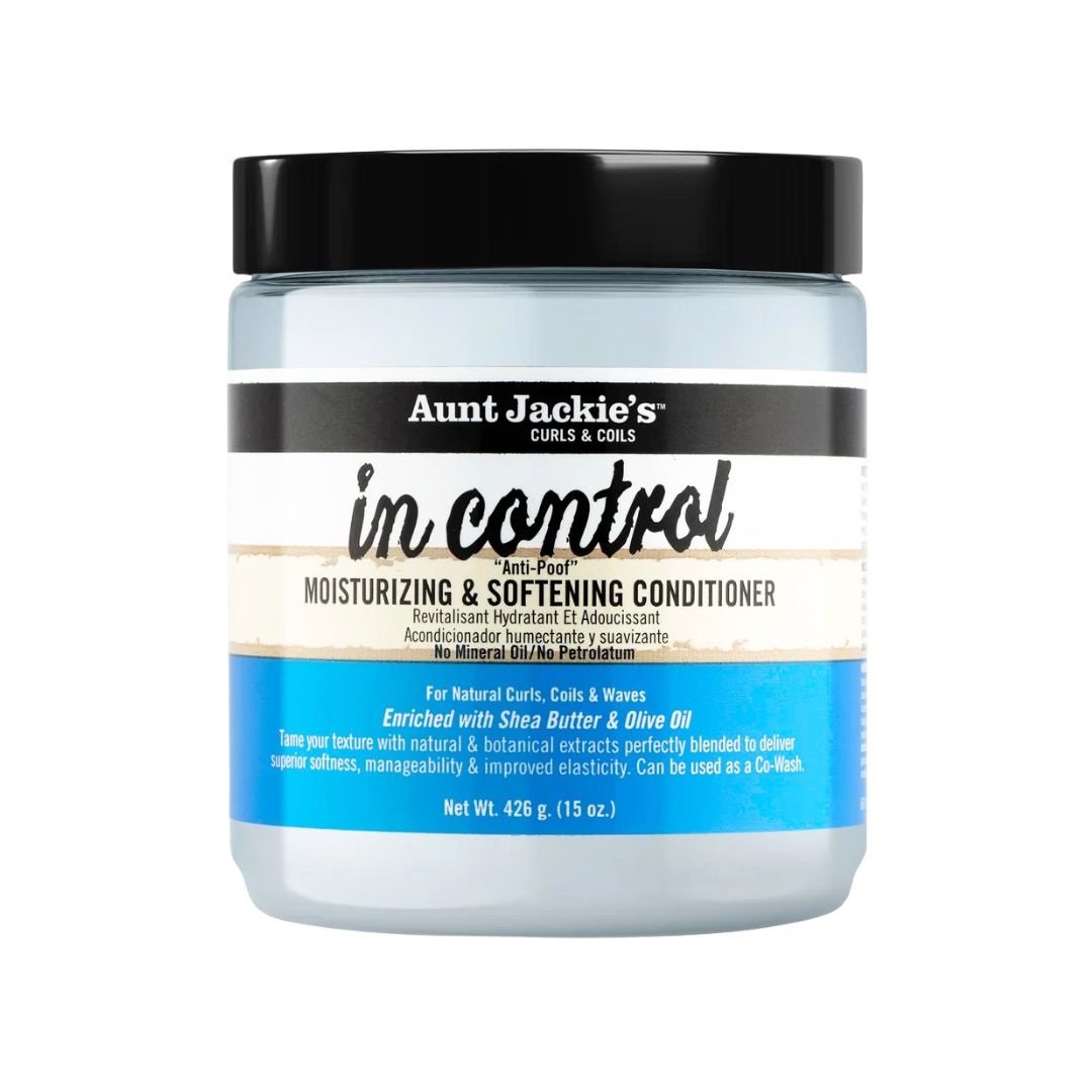Aunt Jackie’s In Control Moisturizing & Softening Conditioner is een intens voedende en herstellende crèmeconditioner die droog, beschadigd of breekbaar haar weer zacht en soepel maakt. De rijke formule hydrateert diep, vermindert pluis en verbetert de elasticiteit, zonder het haar te verzwaren. Ideaal voor wavy, curly en coily haar dat behoefte heeft aan herstel, slip en langdurige hydratatie. Ook perfect als co-wash of als intensieve behandeling na het wassen.