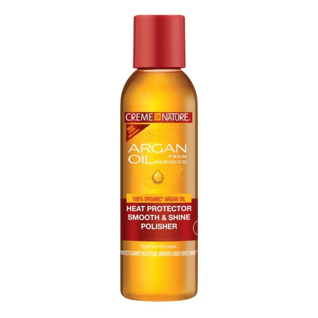 Creme of Nature Argan Oil Heat Protector Smooth & Shine Polisher is een lichtgewicht stylingolie die het haar beschermt tegen hitte van föhn, stijltang en krultang tot 230 °C. De formule is verrijkt met pure Marokkaanse arganolie en helpt het haar glad te maken, pluis te verminderen en een exotische glans te geven. Ideaal als finishing serum of als bescherming vóór het stylen. De olie sluit vocht in, verbetert de handelbaarheid en zorgt voor een zijdezachte finish, zonder vettigheid of build-up.