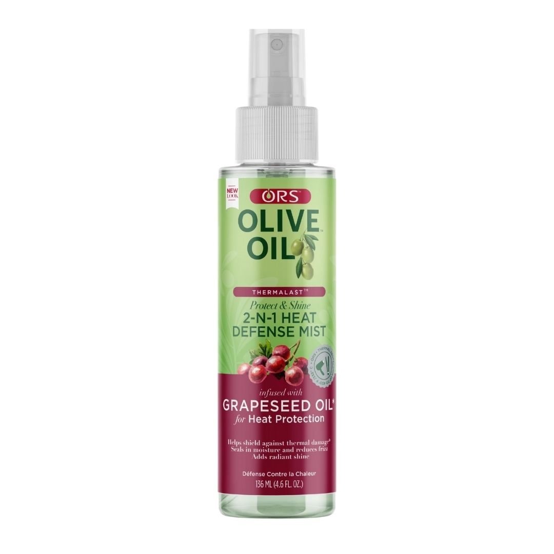 De ORS Olive Oil Thermalast 2-In-1 Heat Defense & Shine Mist is een lichtgewicht, multifunctionele spray die twee cruciale stylingbehoeften combineert: hittebescherming en intense glans.1 De formule is speciaal ontwikkeld om een beschermend schild op het haar te creëren dat schade door thermische stylingtools (zoals stijltangen, krultangen en föhns). Tegelijkertijd temt de mist pluis en statisch haar en zorgt voor een stralende, niet-vette afwerking.